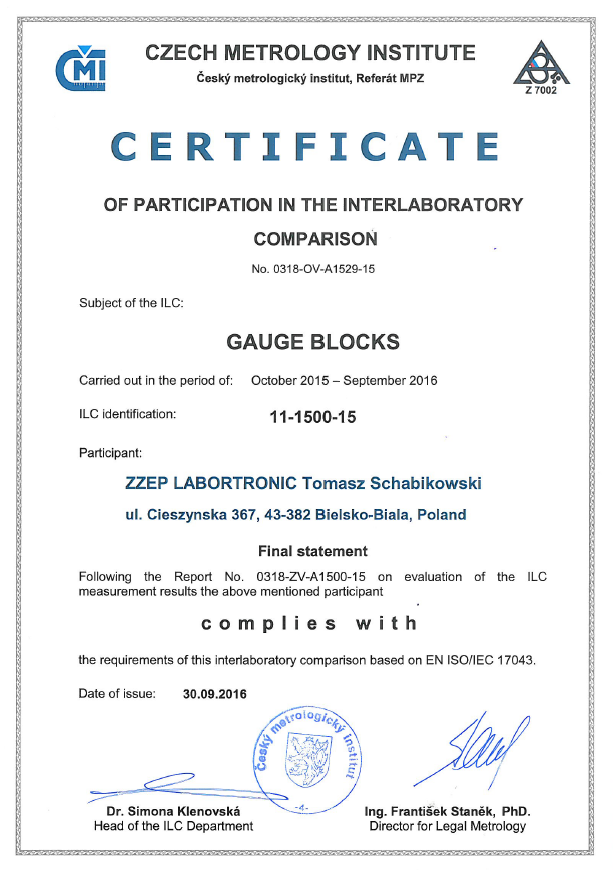 Międzynarodowe porównania międzylaboratoryjne organizowane w terminie od sierpnia 2015 do września 2016 dotyczyły wzorcowania płytek wzorcowych w zakresie (0 - 100) mm. W porównaniach brały udział 33 laboratoria z 17 krajów. Polskę reprezentowały dwa laboratoria, w tym nasze. Uzyskaliśmy wynik pozytywny, co jest dowodem naszego profesjonalizmu i powodem do zadowolenia. Dołożymy wszelkich starań, aby poziom jakości został utrzymany.