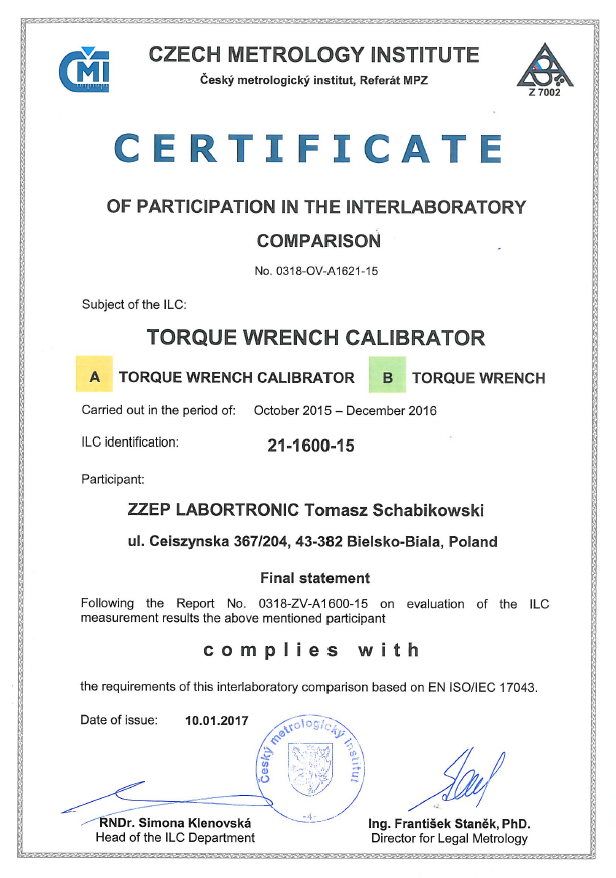 Zakończyły się trwające od października 2015 roku międzynarodowe porównania z kluczy dynamometrycznych oraz momentomierzy, organizowane przez Czeski Instytut Meteorologiczny. Brało w nich udział 20 akredytowanych laboratoriów z krajów z całej Europy, w tym dwa z Polski. Uzyskaliśmy wynik pozytywny, co jest powodem do zadowolenia. Cały czas dokładamy wszelkich starań, aby nasze usługi były najwyższej jakości.